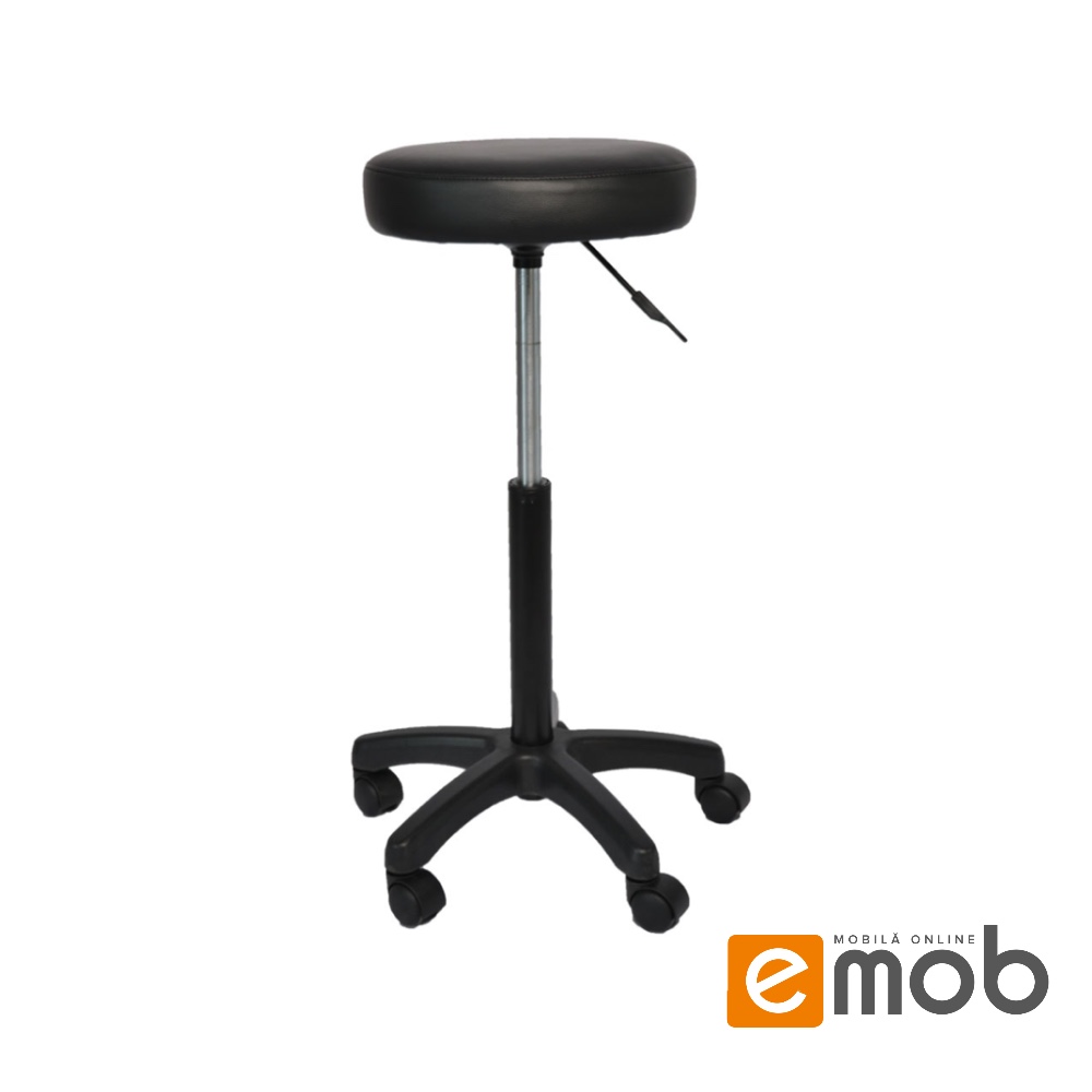 Șezutul taburetului, cu diametru de 35 cm, este tapițat într-un material de eco piele durabilă și ușor de curățat, oferind confort și suport în timpul ședințelor lungi.